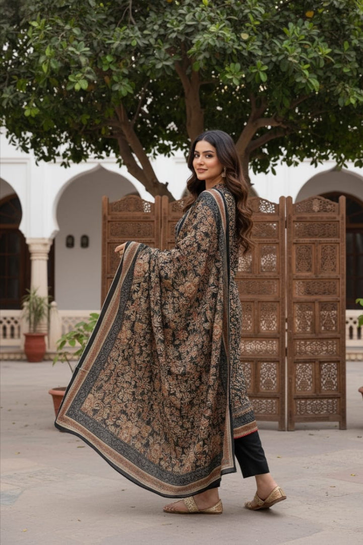 The shirt features an intricate traditional print with warm earthy tones, perfectly paired with a contrast khaddar dupatta and solid black trouser for a refined winter look.